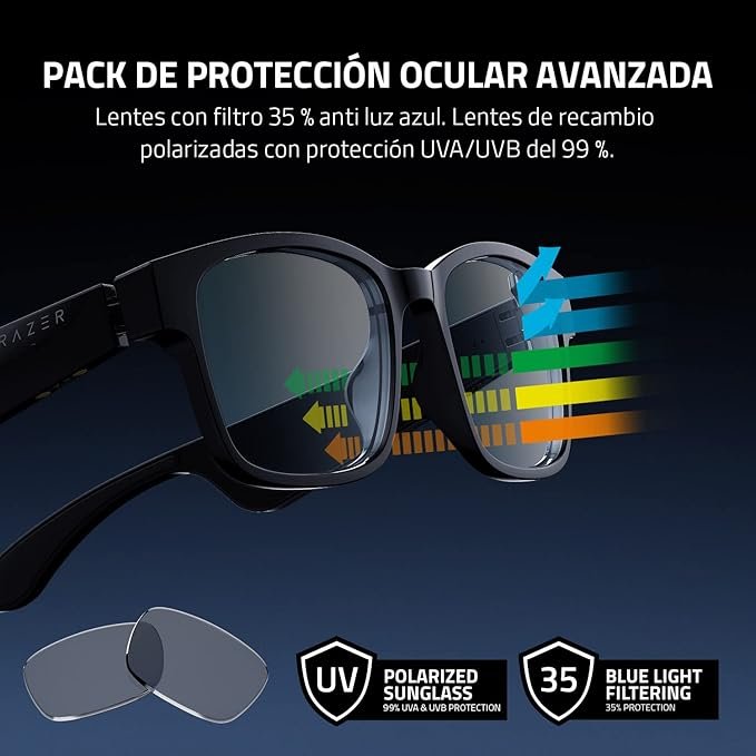 - Lentes filtradoras de luz azul (35 %) + polarizadas (99 % UVA/UVB).